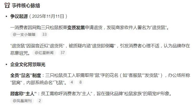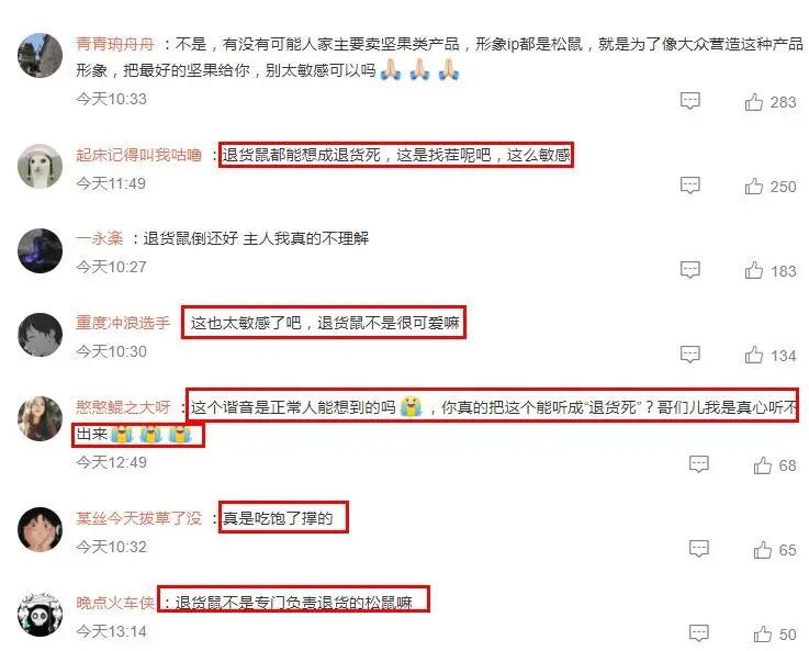11月11日,有消费者因网购三只松鼠板栗,收货后对产品不满意申请退货,发现商家收件人署名为“退货鼠”,因为“退货鼠”谐音联想,被质疑内涵“退货即倒霉”,引发消费者心理不适,认为品牌存恶意诅咒。