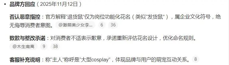 好嘛,顾客是上帝,在三只松鼠这边是“主人”,怎么都有理,虽然三只松鼠明确表达了“属企业文化符号、绝无侮辱消费者意图”的态度,而且明眼人都能认同这一点,但三只松鼠仍然围绕着以“主人”为尊的原则,考虑优化花名的设计原则。