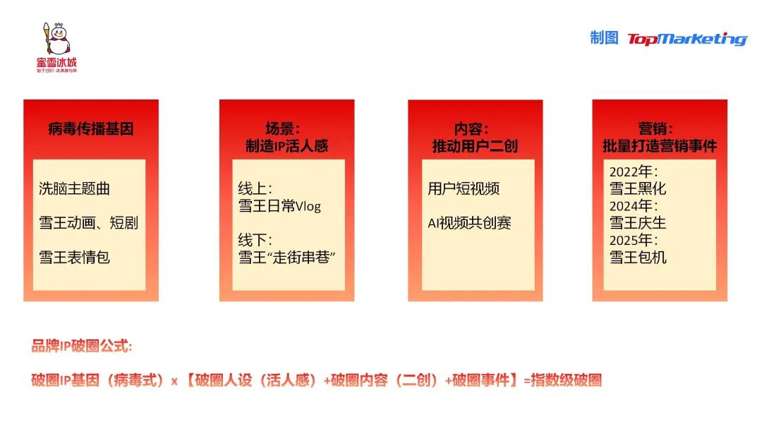品牌IP出圈后也需要长期运营, 蜜雪冰城 的做法是批量打造IP事件营销,比如2022年夏天策划的雪王黑化、2025年策划的雪王专机“制服诱惑”,起到了四两拨千斤的作用。