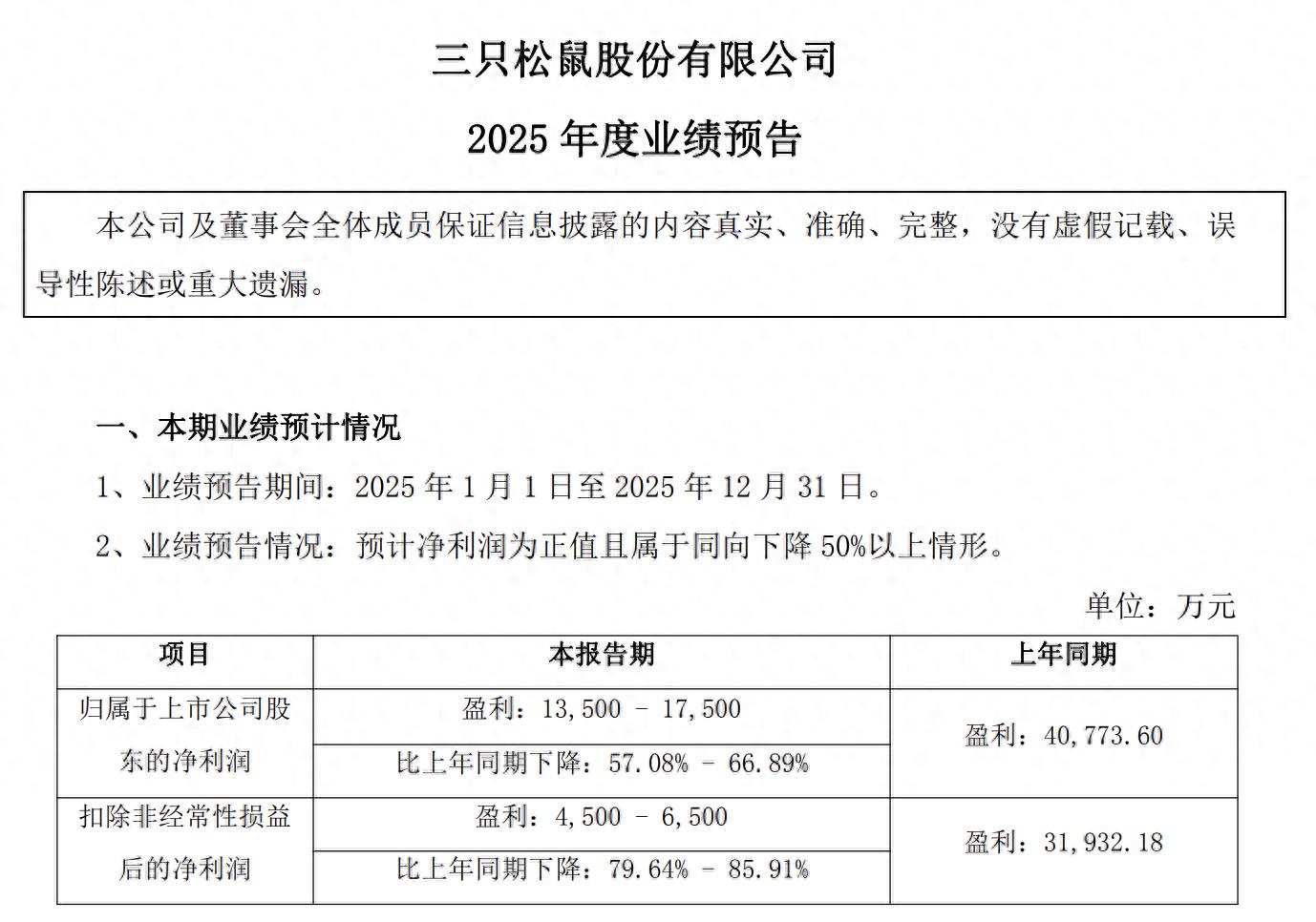 但这种增长仍未摆脱平台依赖,可持续性面临考验。最新业绩预告显示,2025年三只松鼠业绩大幅回落,预计净利润1.35亿元至1.75亿元,同比下降57.08%至66.89%;扣非净利润4500万元至6500万元,同比下降79.64%至85.91%。