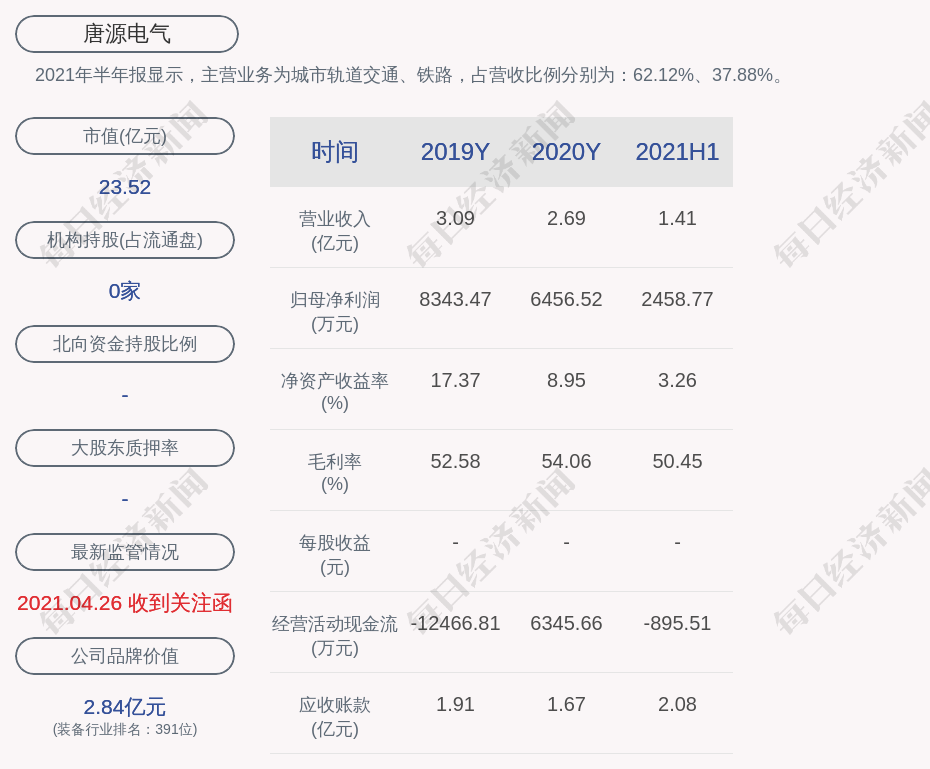 2021年半年报显示,唐源电气的主营业务为城市轨道交通、铁路,占营收比例分别为:62.12%、37.88%。