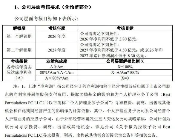 其中,仙乐健康2026年度的公司层面考核要求2026年净利润不低于3.80亿元。2027年净利润不低于4.50亿元;或2026年和2027年累计净利润不低于8.30亿元。