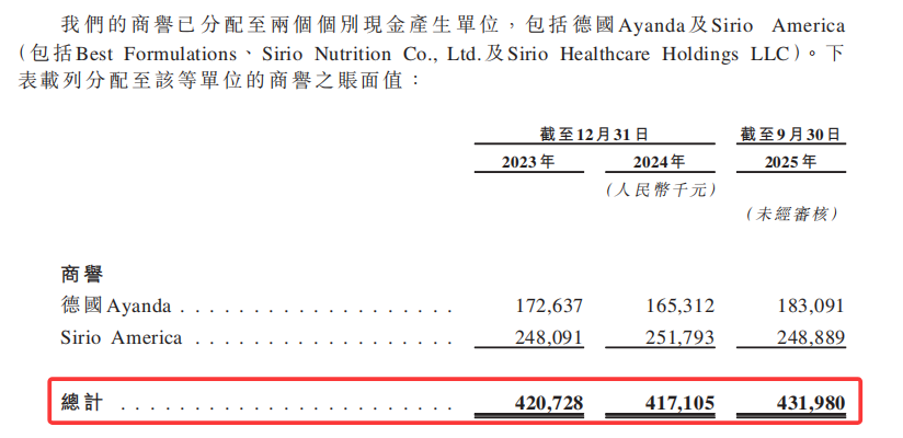 此外,仙乐健康还面临着商誉较高的问题。截至2025年9月30日,公司商誉总额已达4.32亿元,存在减值风险。