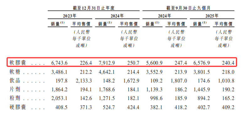 在此背景下,企业定价能力受到挤压。以仙乐健康的核心产品软胶囊为例,平均售价从2024年的250.7元/千粒降至2025年前三季度的240.4元/千粒,降幅达4.1%,而成本结构并未同比优化,侵蚀了公司的毛利率和盈利空间。