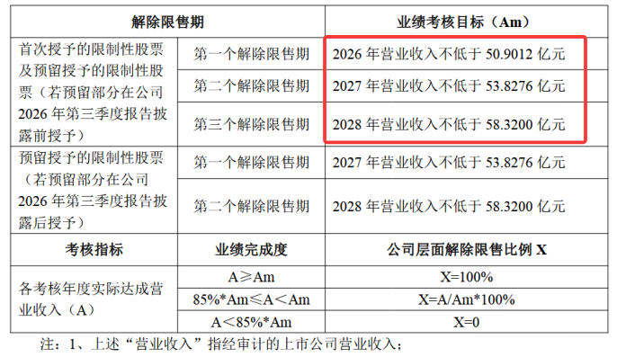 该激励计划的公司层面业绩考核年度为2026-2028年,设定考核指标为2026年、2027年、2028年营业收入分别不低于50.9亿元、53.83亿元和58.32亿元。