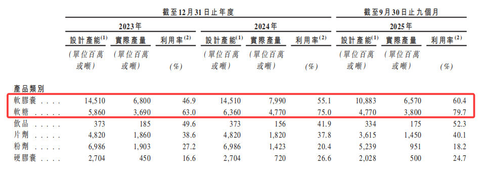 招股书显示,2023年至2025年前三季度,软胶囊的产能利用率分别为46.9%、55.1%和60.4%,虽在逐步提升,但仍不足70%;软糖产能利用率为63.0%、75.0%和79.7%,是所有产品中利用率最高的品类,但仍未达到满产。其余产品产能利用率存在严重不足的情况。在此情况下再次加码产能建设,无疑会加剧产能过剩压力。