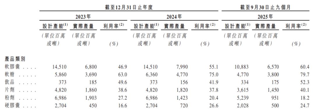 持续扩产的同时,公司目前部分产品的产能利用率仍待提升。2025年前三季度,软胶囊产能利用率为60.4%,片剂、粉剂、硬胶囊的产能利用率均低于50%。