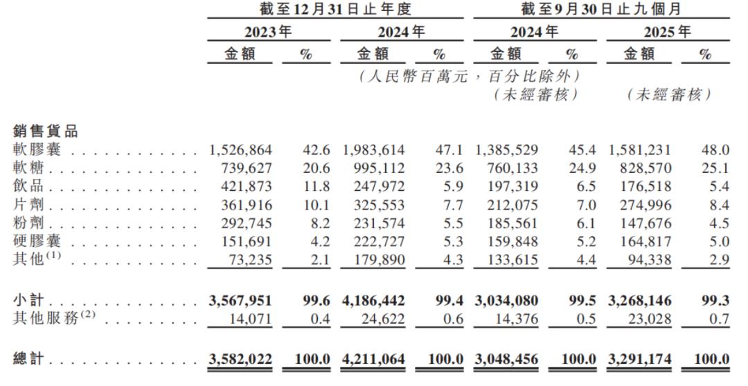 而饮品、片剂、粉剂类产品收入均有不同程度的下滑。2024年及2025年前三季度,饮品类收入同比分别减少41.22%、10.54%,粉剂类收入同比分别减少20.9%、20.42%,片剂收入同比分别变动-10.05%、29.67%。