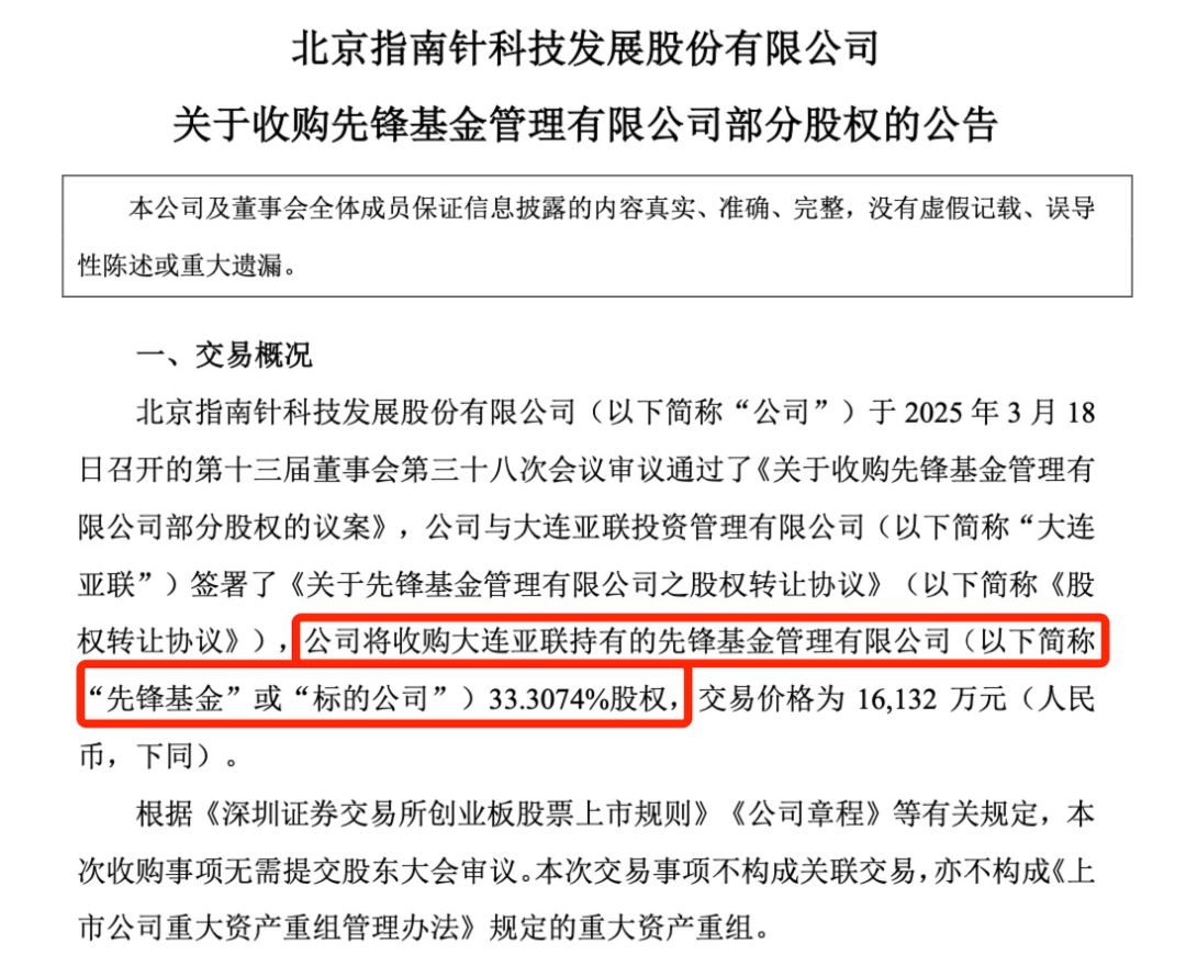 指南针公告称,公司于2025年3月18日召开的第十三届董事会第三十八次会议审议通过了《关于收购先锋基金管理有限公司部分股权的议案》,公司与大连亚联投资管理有限公司签署了《关于先锋基金管理有限公司之股权转让协议》,公司将收购大连亚联持有的先锋基金管理有限公司33.3074%股权,交易价格为16,132万元人民币。