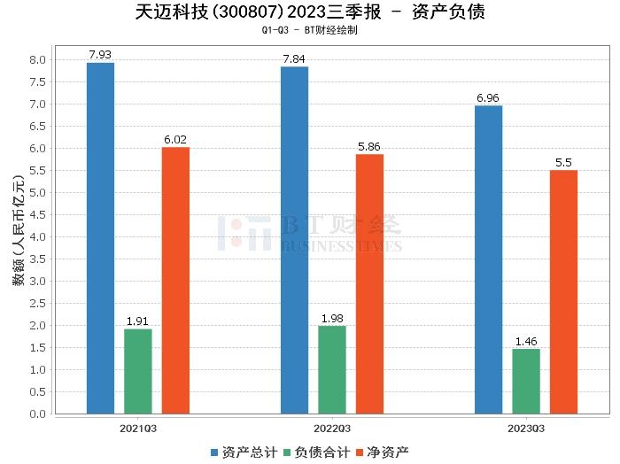 在资产负债方面,天迈科技2023年三季度的资产总计为6.96亿元,相比上年度末的7.77亿元有所下降。负债合计为1.46亿元,较上年度末的1.83亿元有所减少。公司的净资产为5.5亿元,相较于上年度末的5.95亿元有所减少。资产负债率为20.98%,较上年度末的23.48%有所下降。