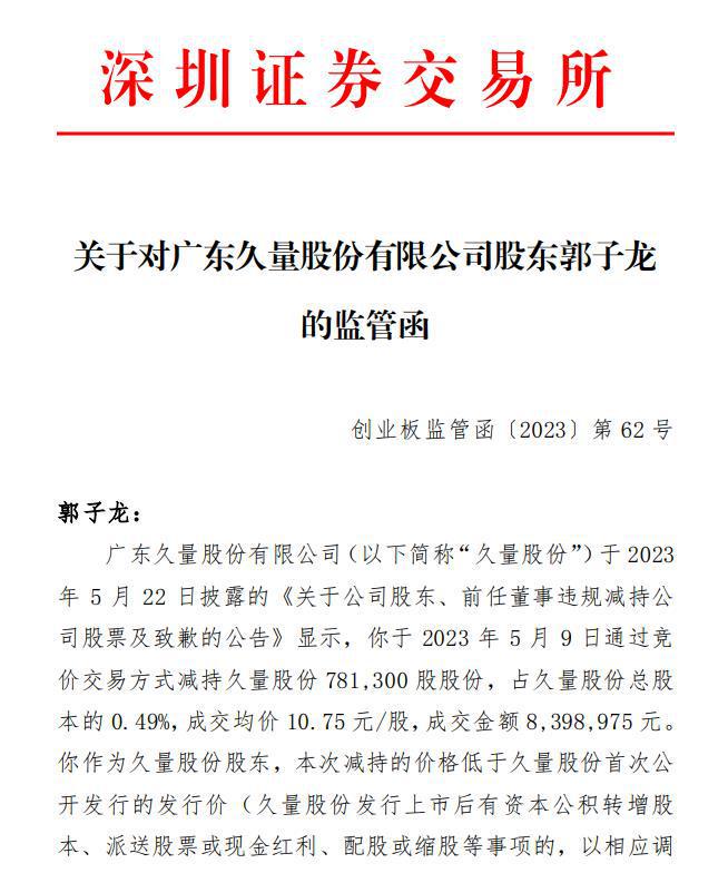 监管函指出,郭子龙作为久量股份股东,本次减持的价格低于久量股份首次公开发行的发行价,违反了于久量股份《首次公开发行股票并在创业板上市招股说明书》中作出的“如本人在承诺锁定期满后两年内减持所持有的公司股份的,减持价格不低于本次发行的发行价”的股份减持承诺。