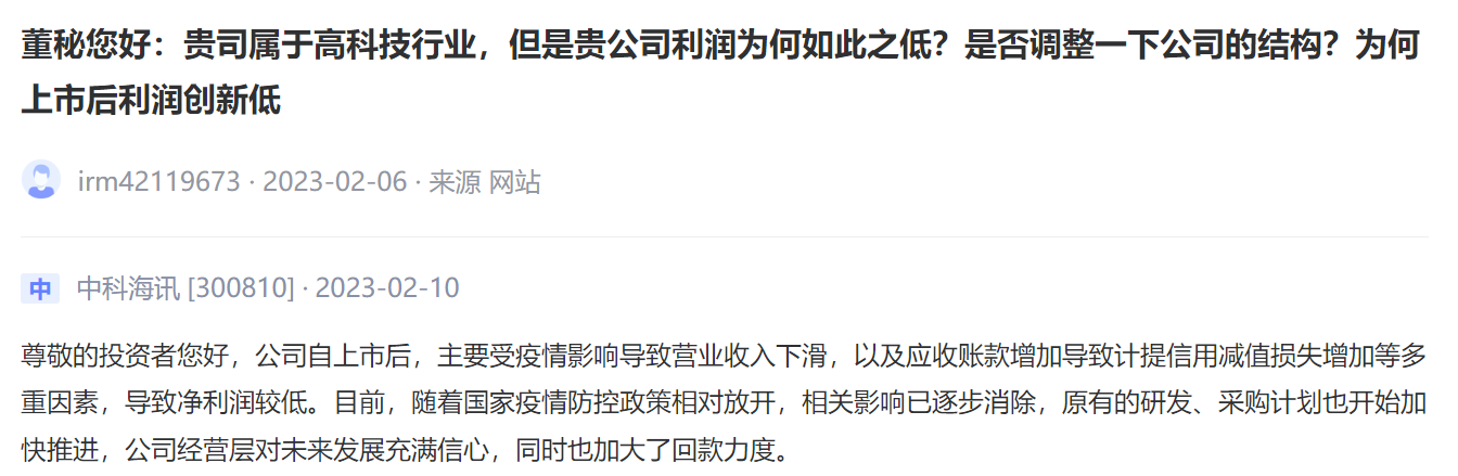 今年上半年,中科海讯曾在互动易向投资者解释业绩下滑的原因。公司称,自上市后,主要受疫情影响导致营业收入下滑,以及应收账款增加导致计提信用减值损失增加等多重因素,导致净利润较低。