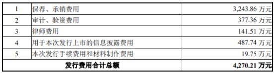 中科海讯首次公开发行股票发行费用合计4,270.21万元,其中保荐、承销费用3,243.86万元。