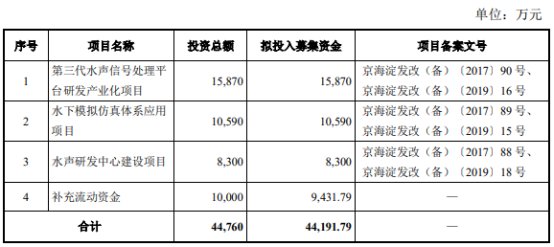 中科海讯首次公开发行股票募集资金总额为48,462.00万元,扣除发行费用后,募集资金净额为44,191.79万元。该公司2019年11月19日披露的招股说明书显示,其拟募集资金44,191.79万元,分别用于第三代水声信号处理平台研发产业化项目、水下模拟仿真体系应用项目、水声研发中心建设项目、补充流动资金。