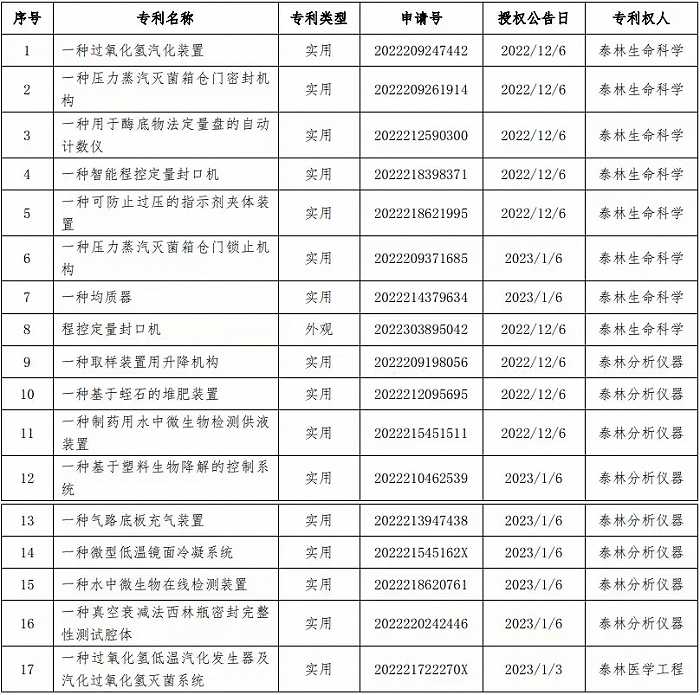 泰林生物1月10日公告,公司全资子公司浙江泰林生命科学有限公司、浙江泰林分析仪器有限公司、浙江泰林医学工程有限公司于近期共取得了17项专利证书以及1项软件著作权证书。专利包括一种过氧化氢汽化装置、一种压力蒸汽灭菌箱仓门密封机构等。软件著作权证书为PharmaSC ADA监控组态软件V1.0。