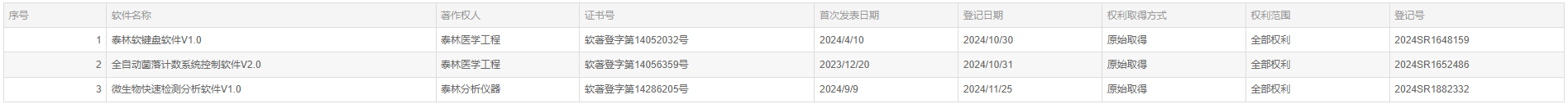 泰林生物(300813.SZ)发布公告,全资子公司浙江泰林生命科学有限公司(以下简称“泰林生命科学”)、浙江泰林医学工程有限公司(以下简称“泰林医学工程”)、浙江泰林分析仪器有限公司(以下简称“泰林分析仪器”)、浙江泰林医疗器械有限公司(以下简称“泰林医疗器械”)于近期共取得了6项专利证书以及3项计算机软件著作权登记证书,具体情况如下: