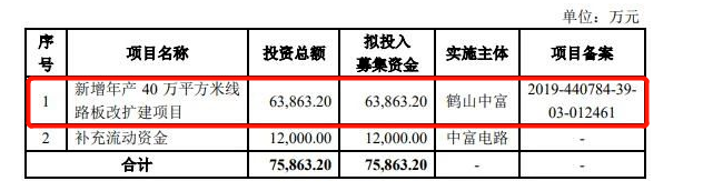 据了解,该项目建设单位和实施主体为公司全资子公司——鹤山中富,鹤山中富主要从事印刷电路板的研发、生产和销售。该项目拟在广东省江门市鹤山市工业城工业一区创利路59号对印刷电路板产品进行扩产建设。募集资金到位后,公司将按项目计划进行厂房建设、装修,逐步引进一批国内外先进生产及检测设备、环保设备,以满足大规模生产高密度、多层、柔性、高频电路板等高附加值产品的基础条件需要,从而达到提升公司产能和自动化水平的目的。该项目预计总投资约6.39亿元,其中建设投资占比97.05%,铺底流动资金占比2.95%。项目实施完成后,达产年将形成各类印制电路板40万平方米/年的生产能力。项目的实施将扩大公司的生产规模,提升公司的产品档次,增强公司核心竞争力,巩固公司在行业内的市场地位。