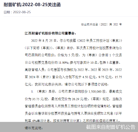 伴随着耐普矿机(300818)亮丽半年报的发布,公司也推出了一份员工持股计划,不过却被监管层盯上了。8月25日晚间,耐普矿机收到了深交所下发的关注函,就公司员工持股计划一事进行了追问。据了解,耐普矿机员工持股计划股票来源为公司已回购的公司股份,价格5元/股,仅为公告前1个交易日公司股票交易均价的11.9%。这也让员工持股计划受让价格太低的合理性遭到深交所质疑。另外,此次员工持股计划虽然设置了业绩考核要求,不过对比公司实际业绩来看,似乎有些“形同虚设”。