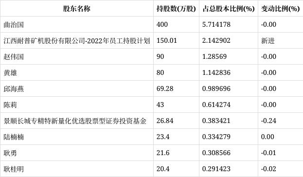 三季报显示,2022年三季度末的公司十大流通股东中,新进股东为江西耐普矿机股份有限公司-2022年员工持股计划,取代了二季度末的姜云。在具体持股比例上,陆楠楠持股有所上升,曲治国、赵伟国、黄雄、邱海燕、陈莉、景顺长城专精特新量化优选股票型证券投资基金、耿勇、耿桂明持股有所下降。