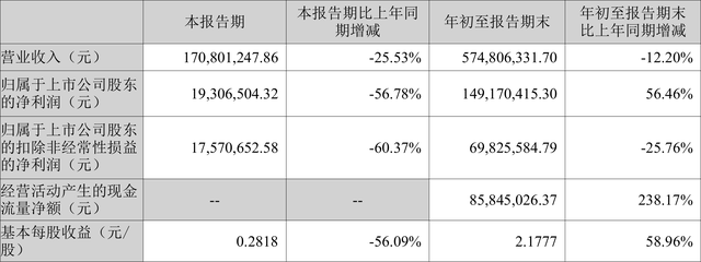 根据三季报,公司第三季度实现营业总收入1.71亿元,同比下降25.53%,环比下降5.13%;归母净利润1930.65万元,同比下降56.78%,环比下降72.50%;扣非净利润1757.07万元,同比下降60.37%,环比增长4.51%。