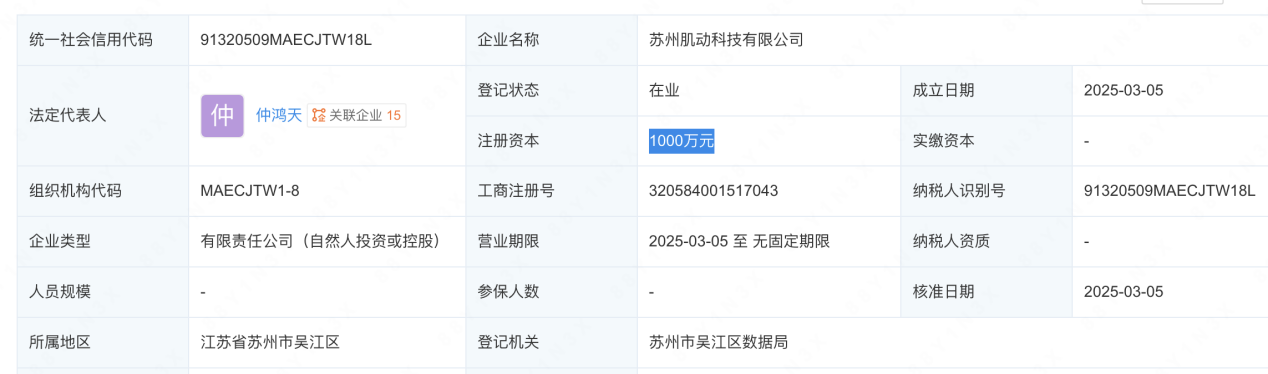 苏州肌动科技有限公司成立于2025年3月5日,注册资本为1000万元,法定代表人为聚杰微纤董事长仲鸿天。从股东构成来看,聚杰微纤以80%的持股比例成为苏州肌动科技有限公司的大股东,陆涛则持有其剩余的20%的股权。