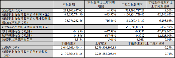 从年初至报告期末(2025年1-9月)来看,公司累计实现营业收入735,796,717.21元,同比增长19.3%;归属于上市公司股东的净利润为-150,834,729.42元,同比骤降12,246.62%;归属于上市公司股东的扣除非经常性损益的净利润为-158,060,471.39元,同比下降6,298.86%;基本每股收益与稀释每股收益均为-0.3082元/股,同比降幅达12,428%;加权平均净资产收益率为-6.96%,较上年同期下降7.01个百分点。