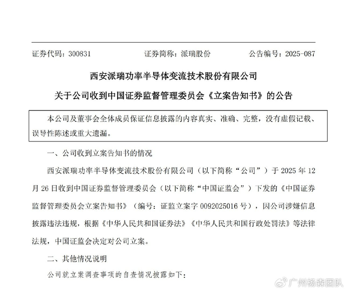 2025年12月26日晚间,西安派瑞功率半导体变流技术股份有限公司(公司或派瑞股份)披露,收到中国证监会下发的《立案告知书》。