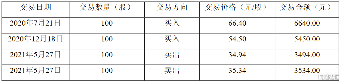 注:交易收益按照先进先出法进行计算,具体收益为:(100股*34.94元-100股*66.4元)+(100股*35.34元-100股*54.5元)=-5062元。邓春艳本次短线交易未产生收益。