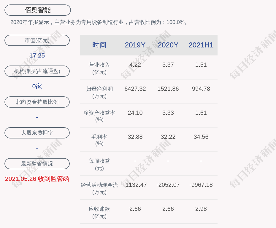 2020年年报显示,佰奥智能的主营业务为专用设备制造行业,占营收比例为:100.0%。