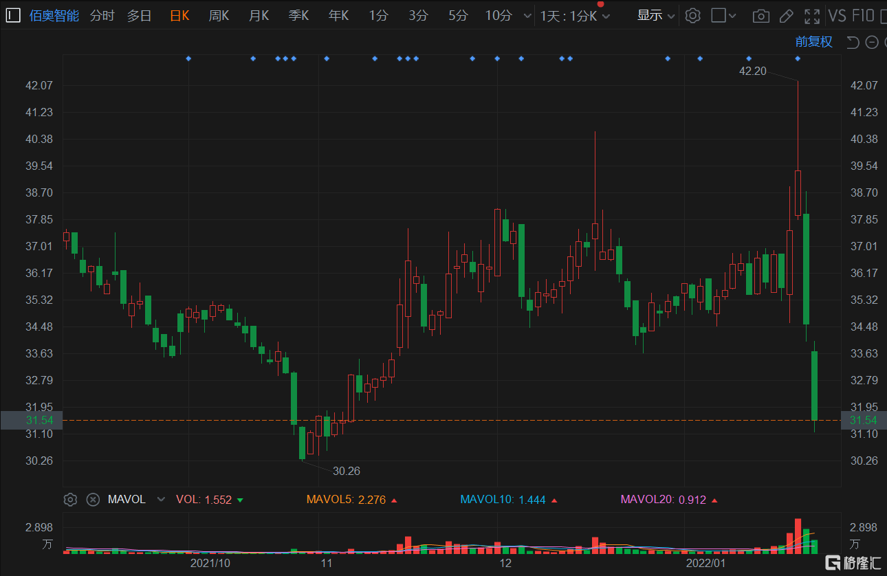 昨日大跌超12%的佰奥智能(300836.SZ)再度下跌9%,报31.54元,总市值15.5亿元。公司24日公告,预计2021年归属于上市公司股东的净利润为亏损600万元-900万元,上年同期则盈利1521.86万元。