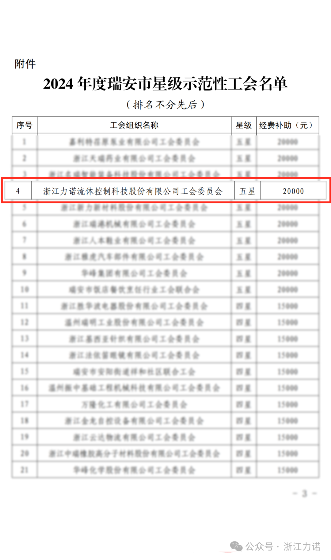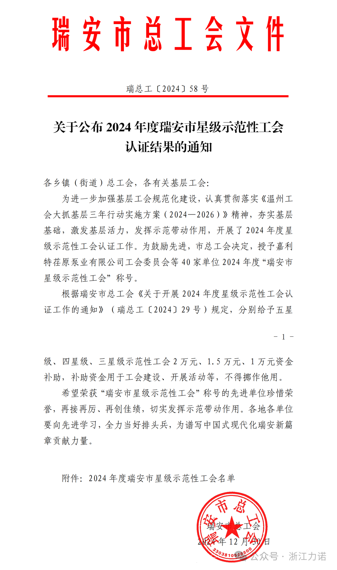 近日,瑞安市总工会公布了《关于公布 2024 年度瑞安市星级示范性工会认证结果的通知》,浙江力诺流体控制科技股份有限公司工会委员会成功获评2024年度「瑞安市五星级示范性工会」称号!