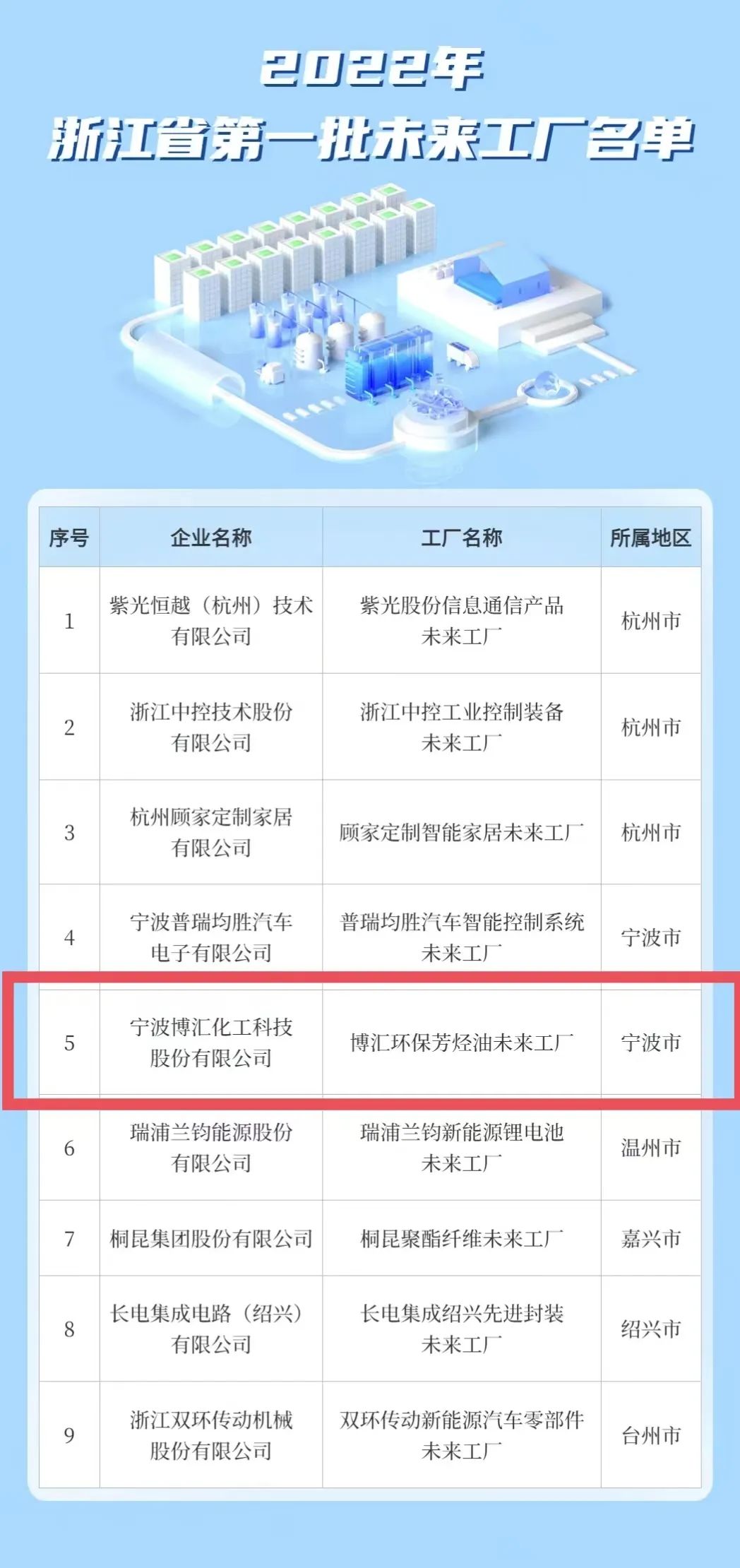 2022年8月26日,浙江省经信公布2022年浙江省第一批未来工厂名单,博汇环保芳烃油未来工厂光荣上榜。