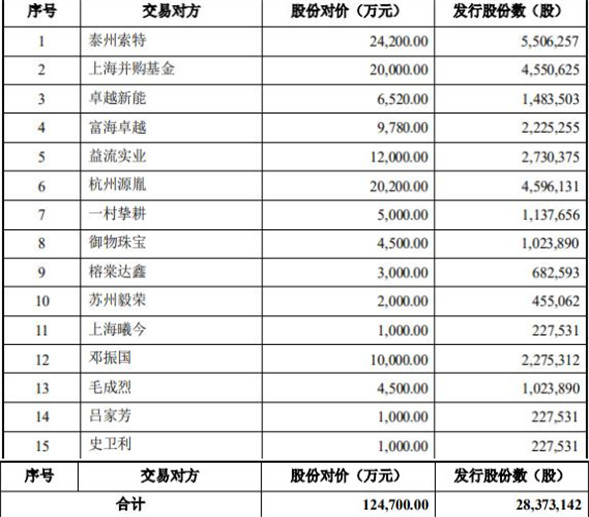 公告显示,公司拟通过发行股份的方式向泰州索特、上海并购基金、卓越新能、富海卓越、益流实业、杭州源胤、一村挚耕、御物珠宝、榕棠达鑫、苏州毅荣、上海曦今、邓振国、毛成烈、吕家芳、史卫利购买其持有的江苏索特100%股权。根据中水致远出具的估值报告,江苏索特100%股权的估值为12.82亿元,经交易双方协商确定交易作价为12.47亿元,公司将以发行股份的方式支付。本次交易完成后,公司除持有江苏索特100%股权外,还通过江苏索特拥有原杜邦集团旗下的Solamet光伏银浆业务。