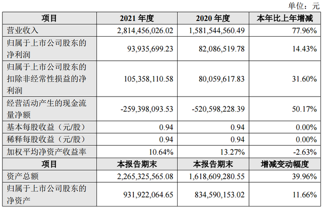 3月9日,帝科股份发布2021年业绩报告称,报告期内,公司实现营业收入2,814,456,026.02元,同比增长77.96%;归属于上市公司股东的净利润93,935,699.23元,同比增长14.43%;归属于上市公司股东的扣除非经常性损益后的净利润105,358,110.58元,同比增长31.60%。