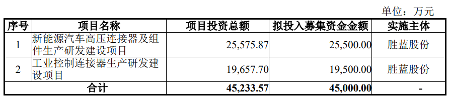 胜蓝股份2025年5月27日披露的向不特定对象发行可转换公司债券募集说明书(上会稿)(豁免版)显示,公司本次可转债计划募集资金总额不超过人民币45,000.00万元,扣除发行费用后将用于新能源汽车高压连接器及组件生产研发建设项目、工业控制连接器生产研发建设项目。