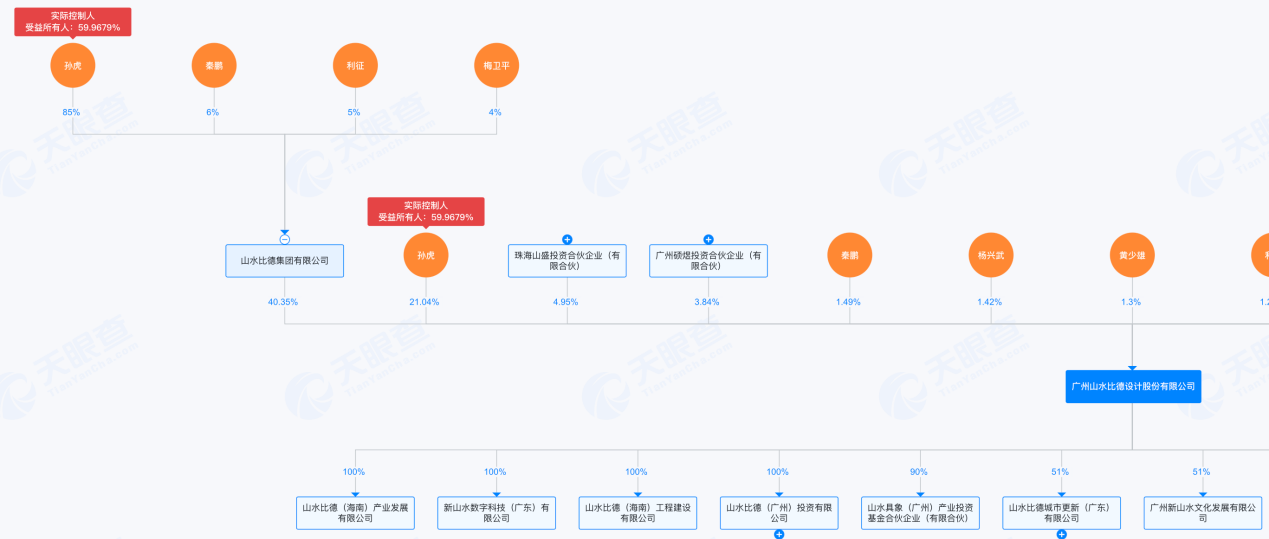 广州山水比德设计股份有限公司成立于2007年,山水比德集团有限公司为该公司的第一大股东,直接持股40.35%,孙虎通过直接及间接持股,持有山水比德59.9679%股权,是山水比德的实际控制人。
