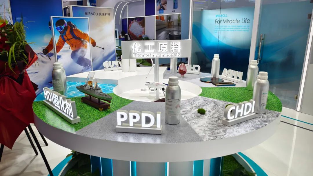 此次橡塑展,美瑞新材展品涵盖聚氨酯新材料(TPU/ETPU/PUD/PUR/EPUR/PBS/EPBS)及功能化工品原料(特种异氰酸酯/特种胺)等产品,并针对不同应用场景分区展示。