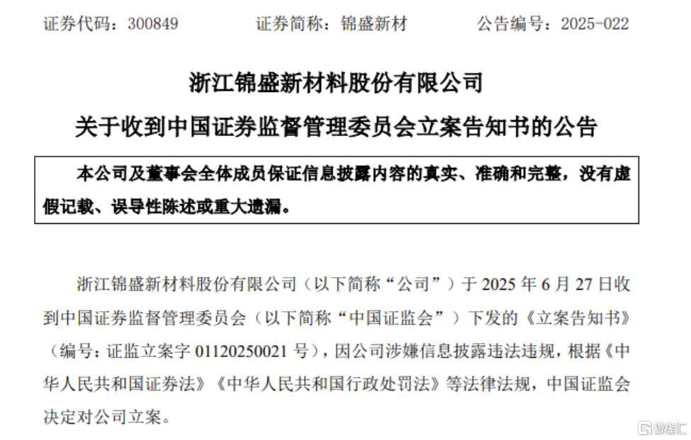 27日晚间,锦盛新材发布公告称,公司于2025年6月27日收到中国证监会下发的《立案告知书》,因公司涉嫌信息披露违法违规,根据《中华人民共和国证券法》《中华人民共和国行政处罚法》等法律法规,中国证监会决定对公司立案。