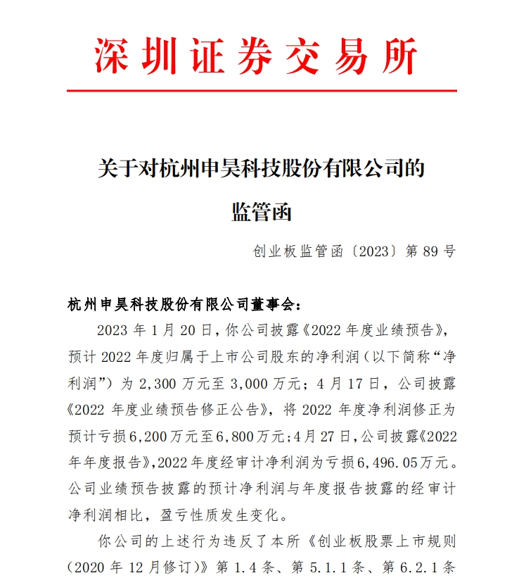 监管函显示,2023年1月20日,申昊科技披露《2022年度业绩预告》,预计2022年度归属于上市公司股东的净利润(下称“净利润”)为2300万元至3000万元。4月17日,公司披露《2022年度业绩预告修正公告》,将2022年度净利润修正为预计亏损6200万元至6800万元。