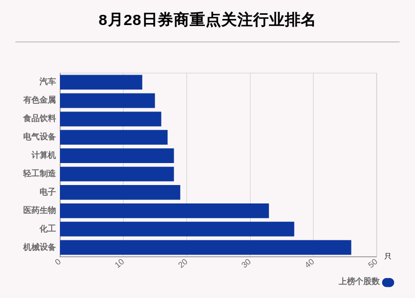 从券商对行业的关注度来看,券商关注个股数居前的行业分别是机械设备、化工、医药生物。