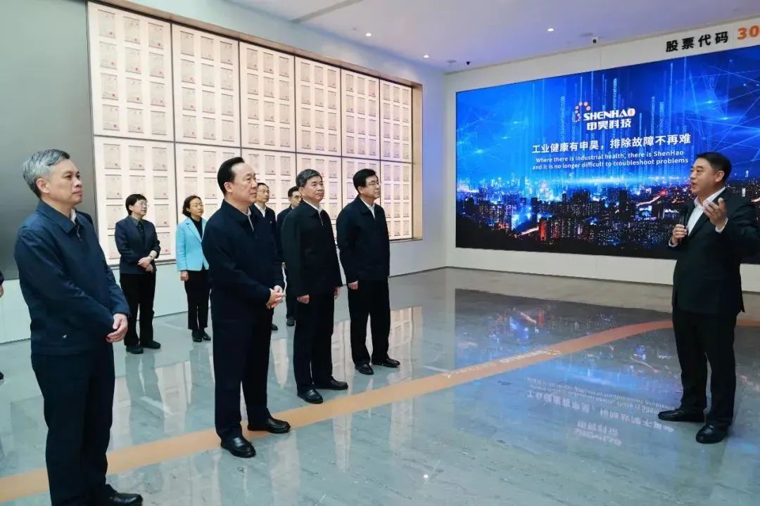3月26日,福建省委书记、省人大常委会主任周祖翼,省委副书记、省长赵龙等福建省党政代表团一行莅临申昊科技,重点围绕数字经济、人工智能、大数据分析等技术赋能传统工业转型升级情况进行调研考察。浙江省委书记、省人大常委会主任王浩,省委副书记、省长刘捷等浙江省领导陪同调研,申昊科技董事长陈如申接待了党政代表团一行。