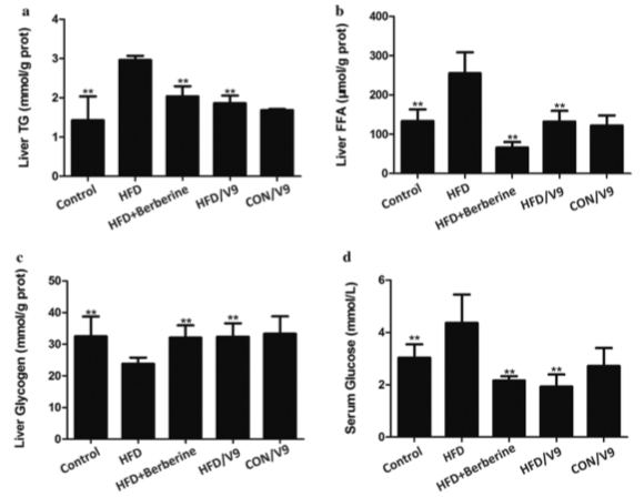 在血液指标方面,乳双歧杆菌V9显著降低血清中丙氨酸转氨酶(ALT)及天冬氨酸转氨酶(AST)水平;在组织学评估方面,乳双歧杆菌V9显著改善了肝小叶结构;通过抑制AMPK,TLR和NF-?B磷酸化信号通路抑制氨基转移,从而改善非酒精性肝病。