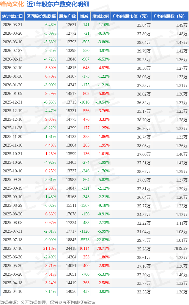 从股价来看,2026年3月20日至2026年3月31日,锋尚文化区间跌幅为6.46%,在此期间股东户数减少141.0户,减幅为1.1%。