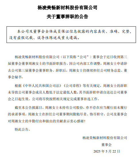 公告显示,美畅股份董事会于近日收到第三届董事会董事周湘女士的书面辞职报告。因公司内部工作调整,周湘女士申请辞去公司第三届董事会董事职务。辞职后,周湘女士仍继续担任公司财务总监、董事会秘书。