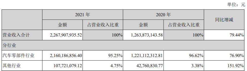 在营业收入合计中,汽车零部件行业实现营业收入金额为21.6亿元,占营业收入比重为95.25%,同比增长76.90%。
