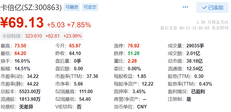 5月11日,截至收盘,卡倍亿(SZ:300863)涨7.85%,现报69.13元,成交额为2.01亿元,总市值为38.18亿元。