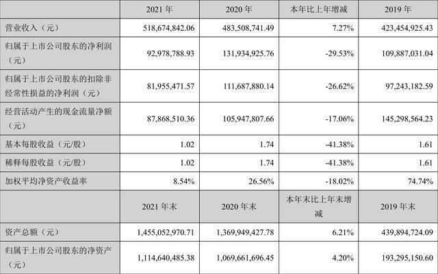 截至2021年末,公司经营活动现金流净额为8786.85万元,同比下降17.06%;筹资活动现金流净额-5108.89万元,同比减少7.75亿元,主要原因是2021年上市收到的募集资金所致;投资活动现金流净额-3.49亿元,上年同期为-4.31亿元。