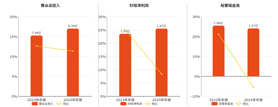 公司营业总收入为8.34亿元,较去年同报告期营业总收入增加8504.77万元,实现5年连续上涨,同比较去年同期上涨11.36%。归母净利润为1.67亿元,较去年同报告期归母净利润增加1287.24万元,实现3年连续上涨,同比较去年同期上涨8.33%。经营活动现金净流入为1.57亿元。