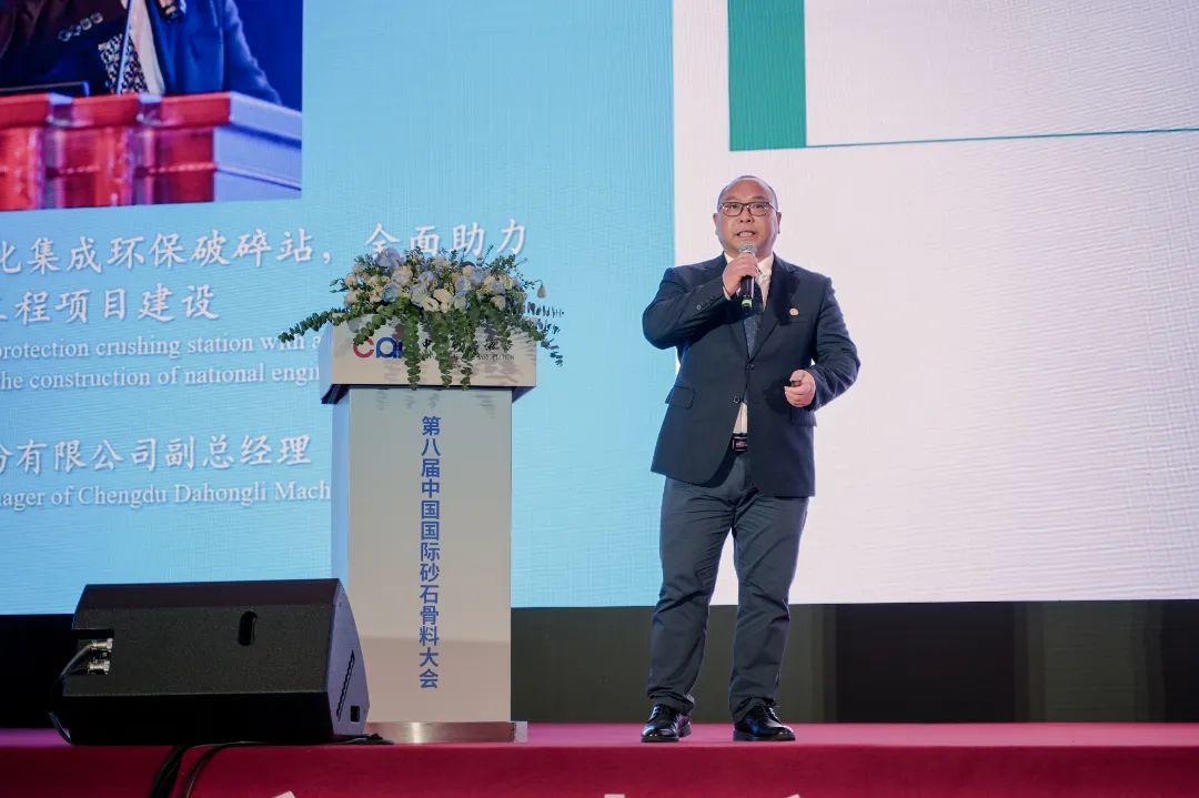 销售副总甘泽清在会上作主题为“时产300吨模块化集成环保破碎站,全面助力国家工程项目建设”的精彩演讲,演讲内容吸引了众多现场参会人员来到大宏立展位深入交流。