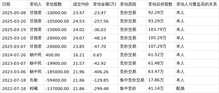 深交所公开信息显示,5月8日,大宏立董事、高管甘德君在竞价交易公司股票,减持股数1.00万股,成交均价23.47元,变动金额23.47万元,变动后持股数为92.29万股。
